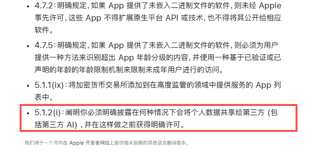 近日,Apple更新了App Store审核指南(App Review Guidelines 5.1.2 (i)),首次直接点名“第三方AI”,并明确:只要你的应用把用户数据传给外部AI服务,全部都必须申报、披露,并获得用户明确同意,否则将被拒审。