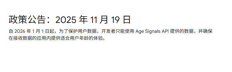 当很多开发者还在聚焦版本迭代、投放优化时,Google Play 已用一则新规划定了 2026 年的合规红线:1 月 1 日起,Age Signals API 将成为判断用户年龄的唯一合法入口。